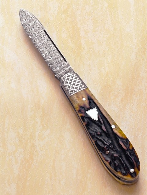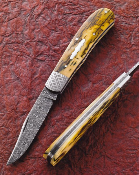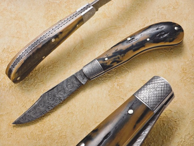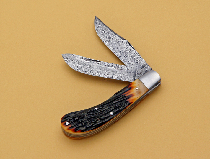 Both blades on this Damascus trapper are forged from 1075 and 15N20 steels in a feathered pattern. The bolsters and pins are produced from 416 stainless. The handle scales are India stag. Chuck Ward Photo |