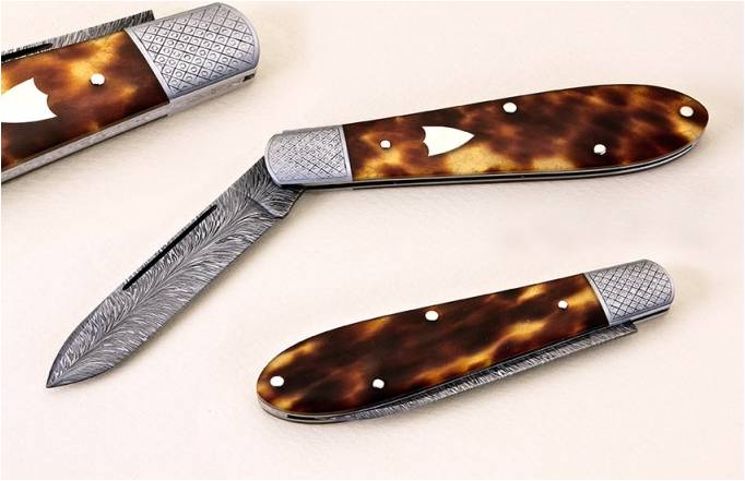 California Jack This slip-joint folder's two and three-quarter inch Damascus blade is forged from 1075 and 15N20 steels in a feathered pattern. The 416 stainless bolsters are engraved by the maker. The shield is 18K gold and the pins are 14K gold. The handle features antique shell scales. Johnny Stout Photo