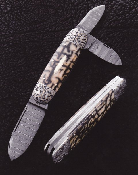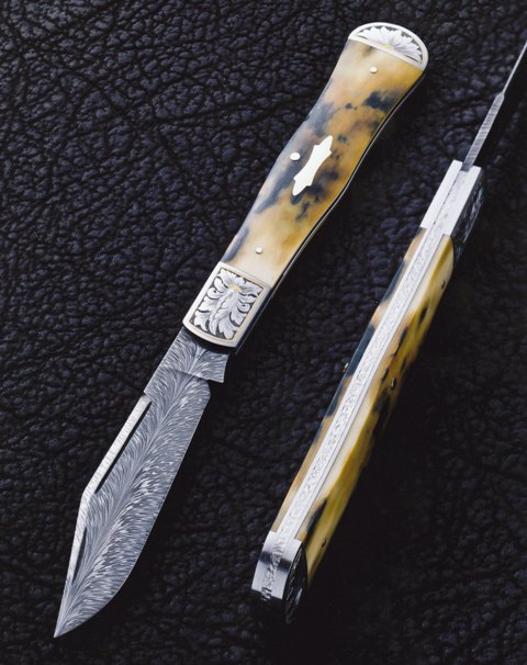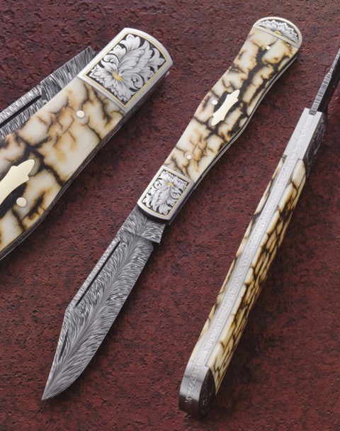 Coke Bottle Folder It is five and three-eighths inches long closed. The feather patterned Damascus blade is forged from 1075 and 15N20 steels. Texturing sets off the back spring which is made from ATS34 stainless steel. The 416 stainless front and rear bolsters are engraved and gold inlayed by Steve Dunn. The handle features fossilized mammoth ivory scales secured by 14-karat gold pins and a 14-karat gold escutcheon. Eric Eggly, PointSeven Studios Photo |