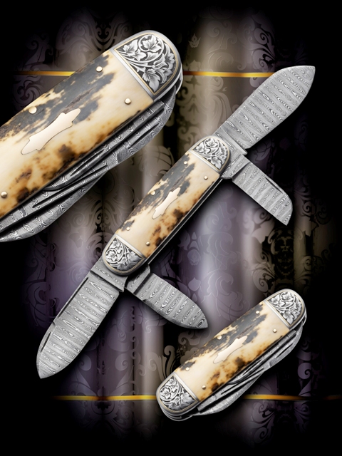 Single-Bladed Trapper Goblin-patterned Damascus forged from 1075 and 15N20 steels is featured on the blade. The back spring is made from Damascus steel. The 416 stainless steel bolsters are engraved in a cross-hatched and punch-dotted pattern by the maker. The handle features mammoth ivory and is set off by 416 pins and escutcheon Eric Eggly, PointSeven Studios Photo