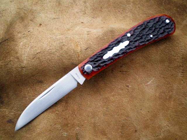 Shadow Pattern Warncliff This slip-joint folder has a 2 7/8" blade crafted from CPM154 stainless steel. It has stainless steel spring, pins, and shield and a jig-bone handle. Overall length is 6 9/16". Close length is 3 3/4". This folder is a very nice, light pocketknife that would be as much at home in your pocket as in your collection.