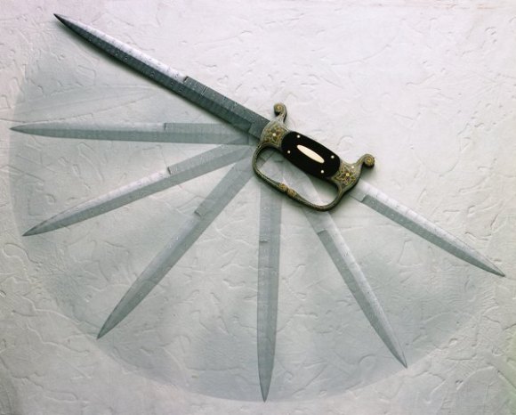 and 01 steels. The clamshell guard and pommels are fashioned from 192 layer